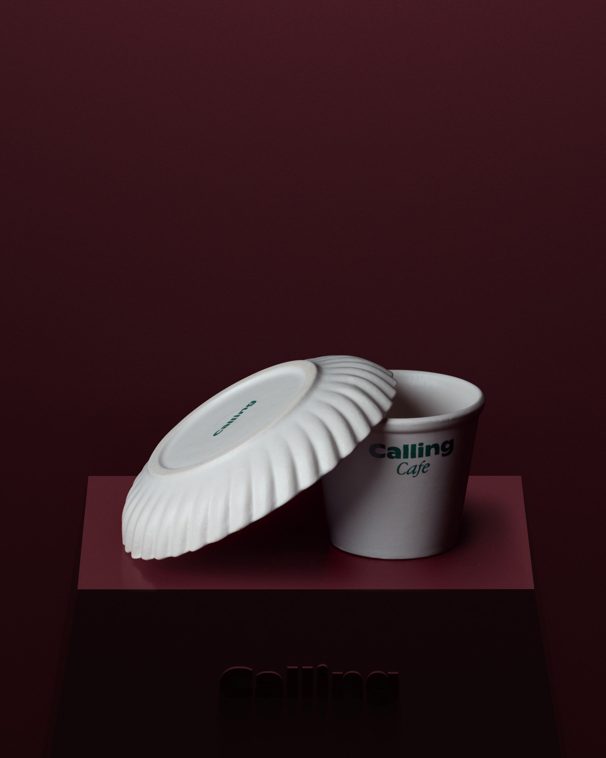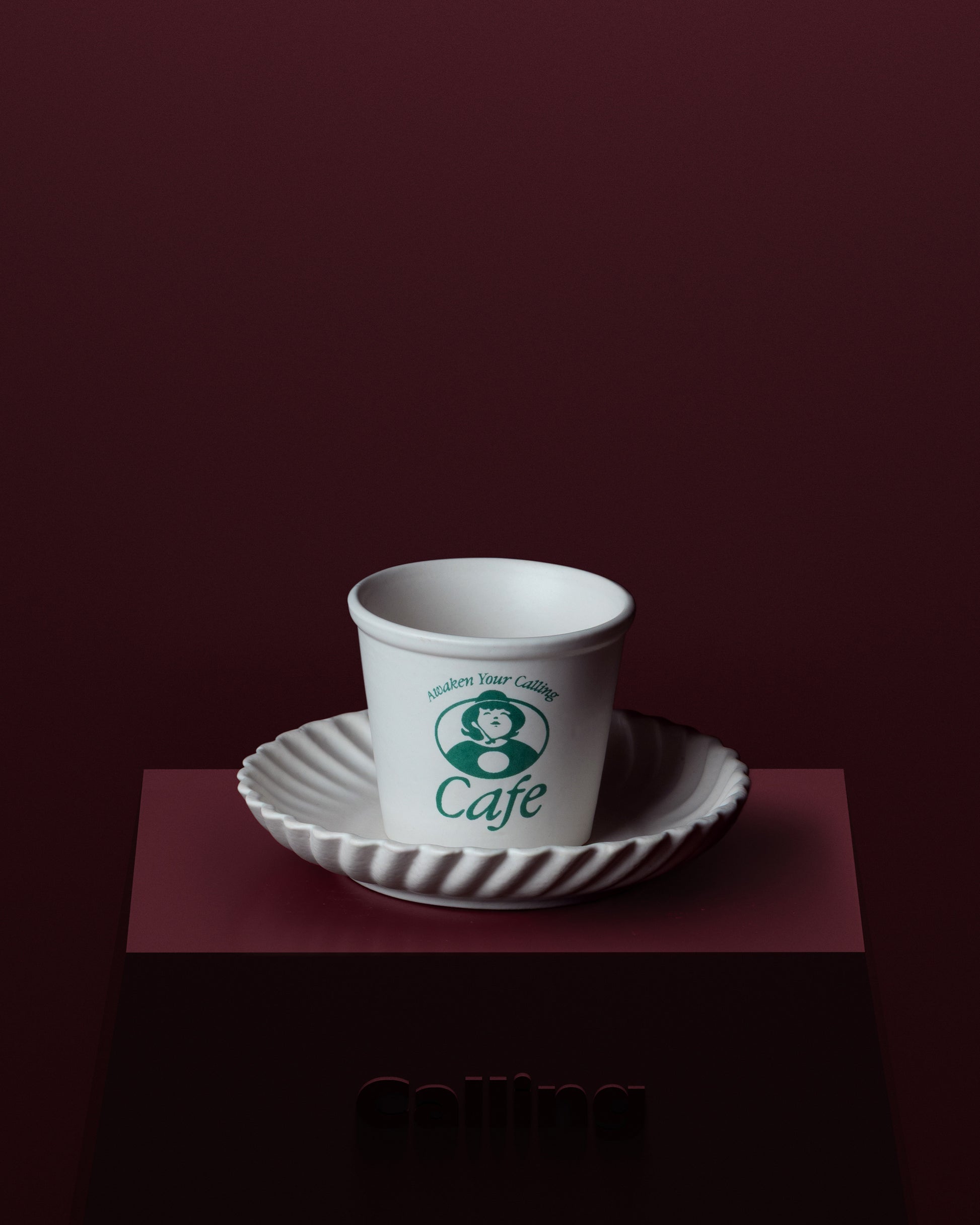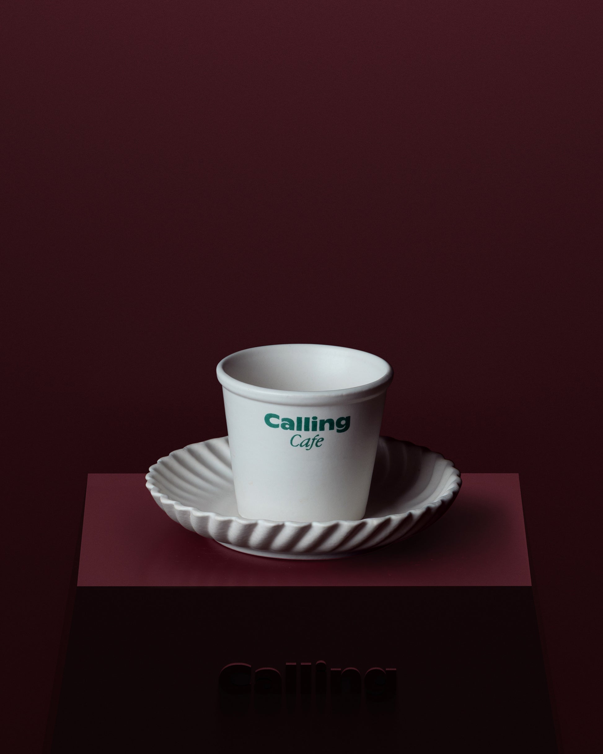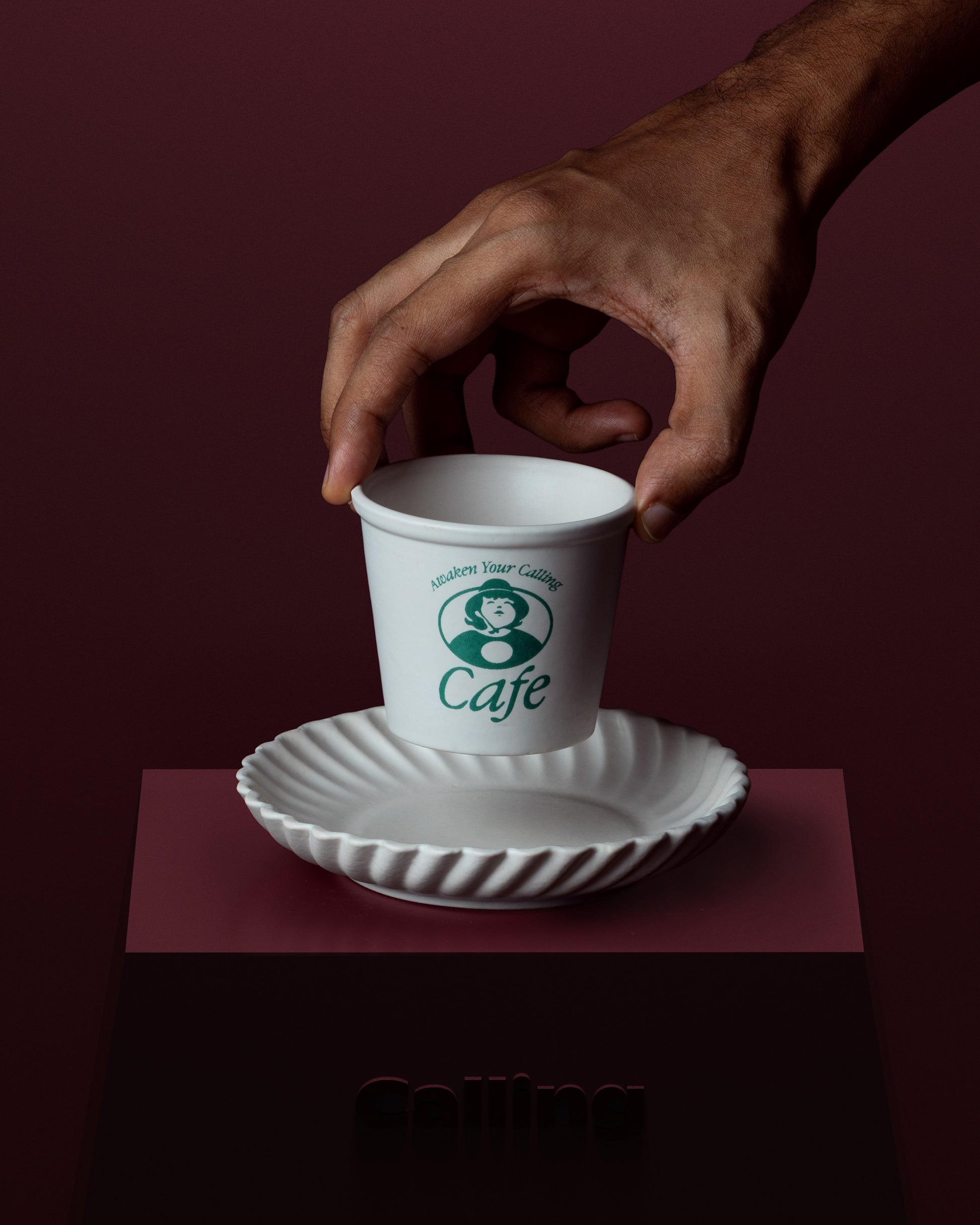 This is a set of one cup (120ml) and one plate in a matte ceramic finish. The cup features ‘Awaken Your Calling’ on one side and ‘Calling Cafe’ on the other.