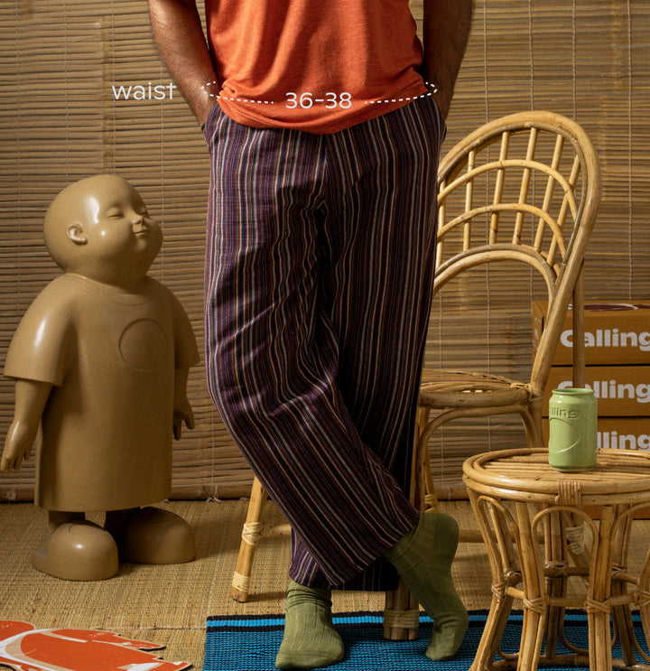 100% Recycled relaxed fit ankle length pants with a drawstring and an elastic waist and the Calling logo embroidered on the back. Handwoven with skill and care by artisans in India.