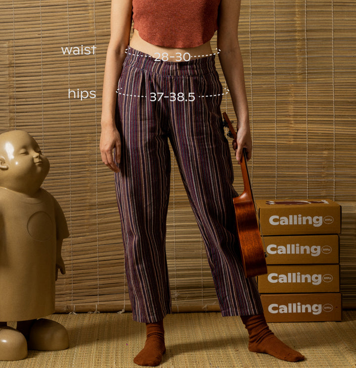 100% Recycled relaxed fit ankle length pants with a drawstring and elasticated waist, featuring the Calling logo embroidered on the back. Handwoven with skill and care by artisans in India.